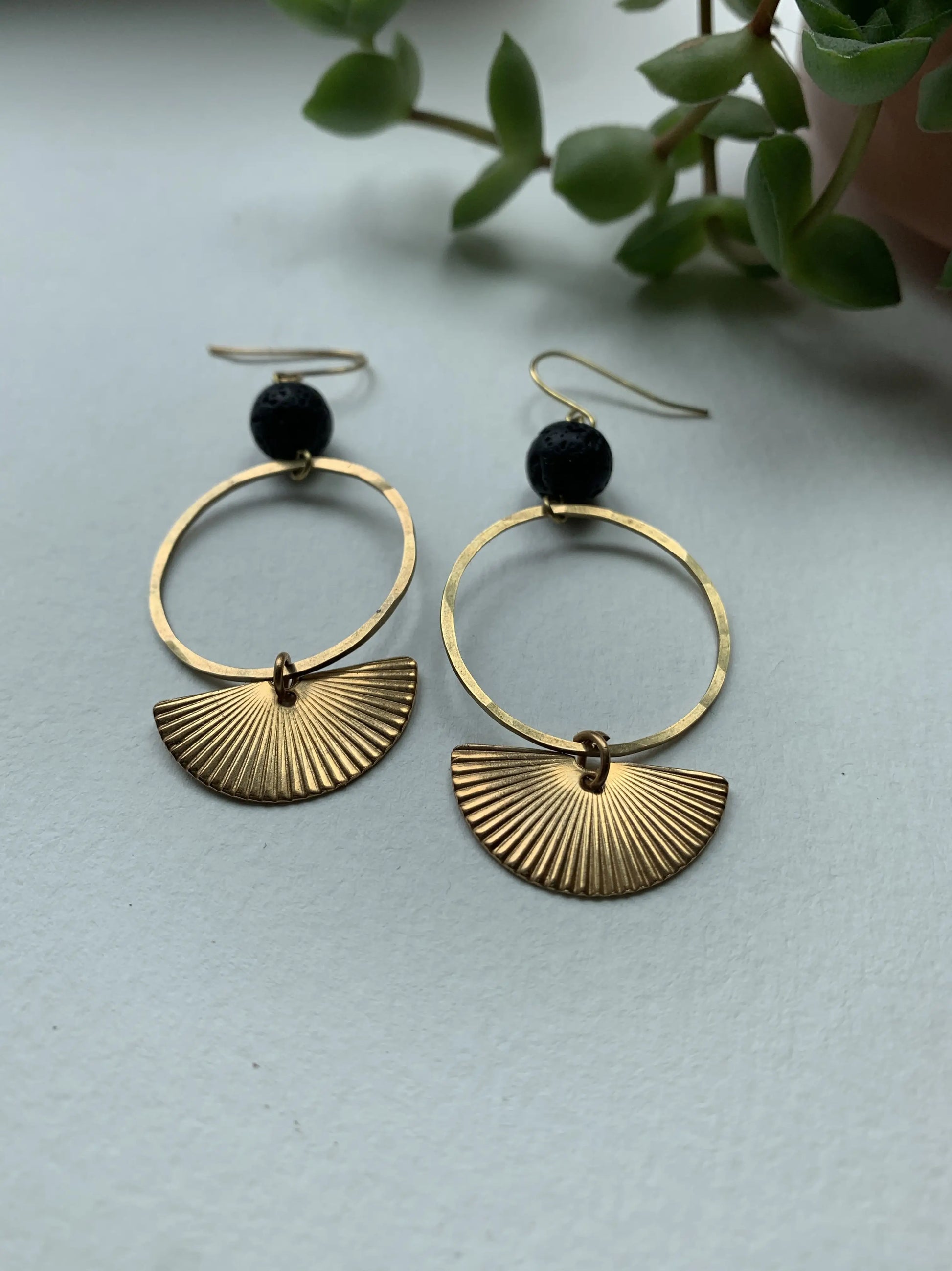These little hammered brass earrings feature a brass sunburst and a black lava bead. They measure about 2” long and are hung from brass ear wires. These have the added benefit of allowing you to add a drop of your favorite essential oil onto the lava rock bead for aromatherapy benefits all day long!